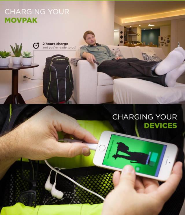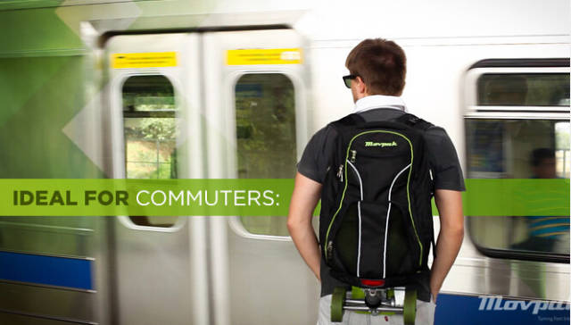 Movpak 背包电动车的尺寸为60*30 cm,重量不到 8kg,内置了一块可以行使 9 英里(约15 公里)的可充电电池,最高时速能够达到 24km/h。Movpak 的外观和普通背包差不多,只是多了两个轮子,除了双肩包与滑轮箱功能外,它还是一个可伸缩的电动滑板,刹车和方向均由遥控器控制,滑板收起后有专门的置放空间,背包背在身上不会有异物感,这样设计的好处是滑板收起后不会占用背包内部空间,有足够的空间装下笔记本电脑与其他杂物。