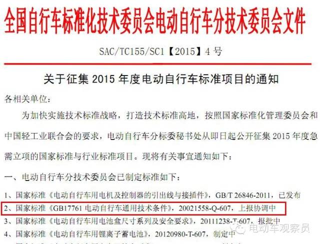 近日,国家轻型电动车及电池产品质检中心发布了《关于征集2015年度电动自行车标准项目的通知》,观察员截图了文件的一部分,其中红框内为电动车新国标的进度。