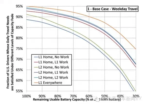 该图显示,当电池容量只有最初的70%时,约有85%的人日常出行不会有任何问题;即使是电池容量到30%时,仍有55%的人行驶不存在任何问题。