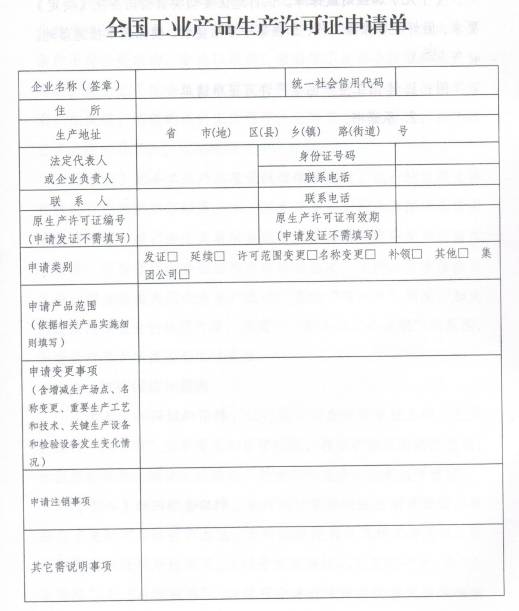 附:1. 全国工业产品生产许可证申请单